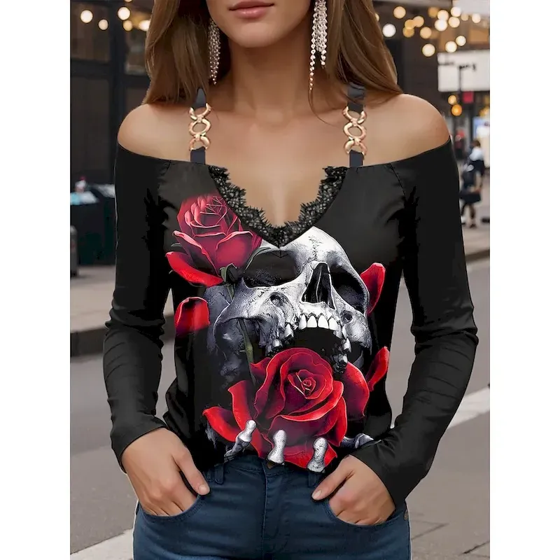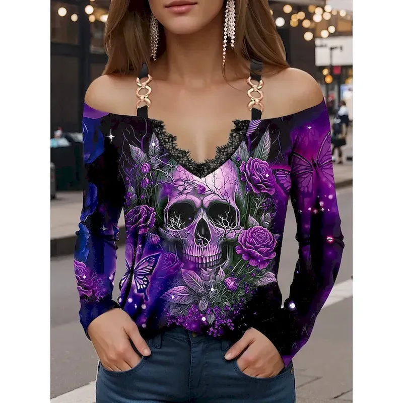 Halloween Women’s Blouse Floral Skulls Print Graphic Skull Vintage Stylish Casual Long Sleeve V Neck Regular Tops Daily Going out Patchwork Print White Wine Red Purple Khaki Spring Fall