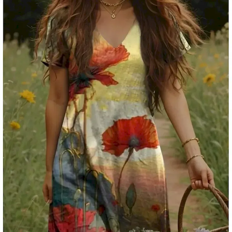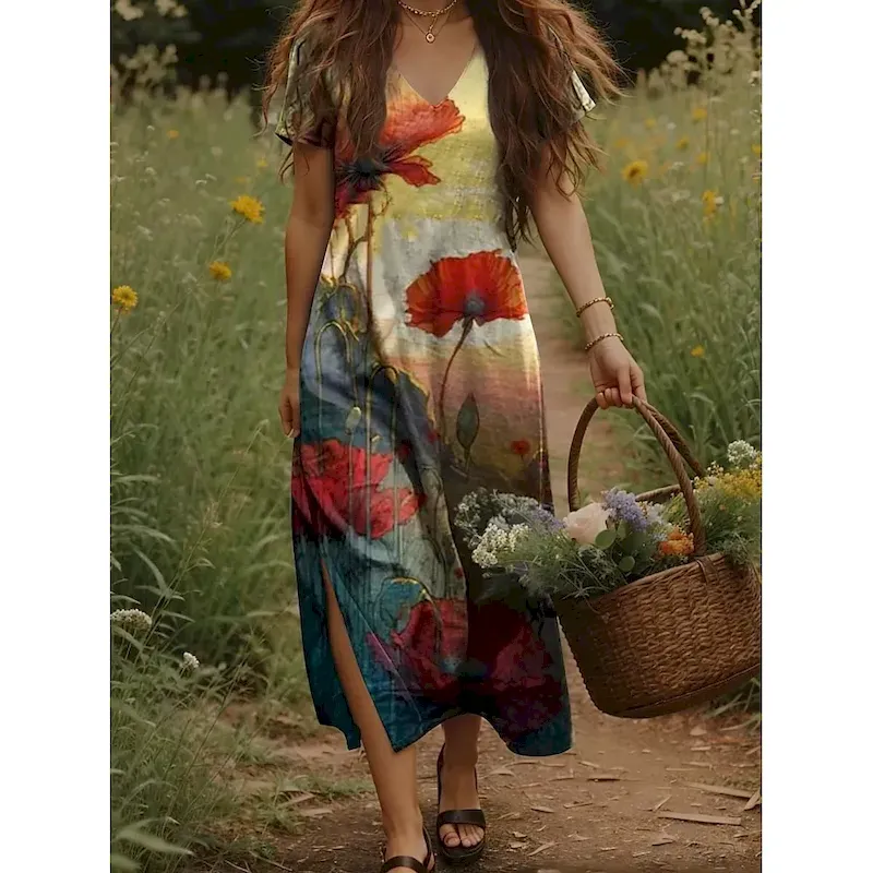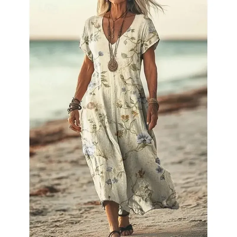 Women’s Maxi Dress Casual Dress A Line Dress Bohemia Vacation Vintage Vacation Daily Regular Fit Floral Short Sleeve V Neck Yellow Purple Beige Summer Spring