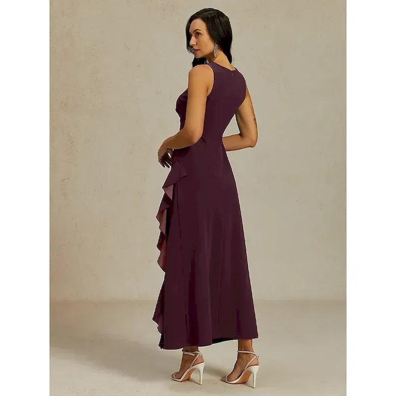 1.Dresses Type: Sheath Dress2.Fabric: Polyester3.Gender: Women’s4.Design: Ruffle5.Occasion: Wedding Guest Cocktail Party6.Dress Length Type: Maxi Dress7.Neckline: Crew Neck Boat Neck8.Sleeve Length: Sleeveless9.Pattern: Solid Color10.Season: Fall Summer Spring
