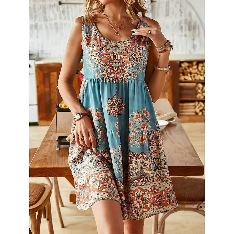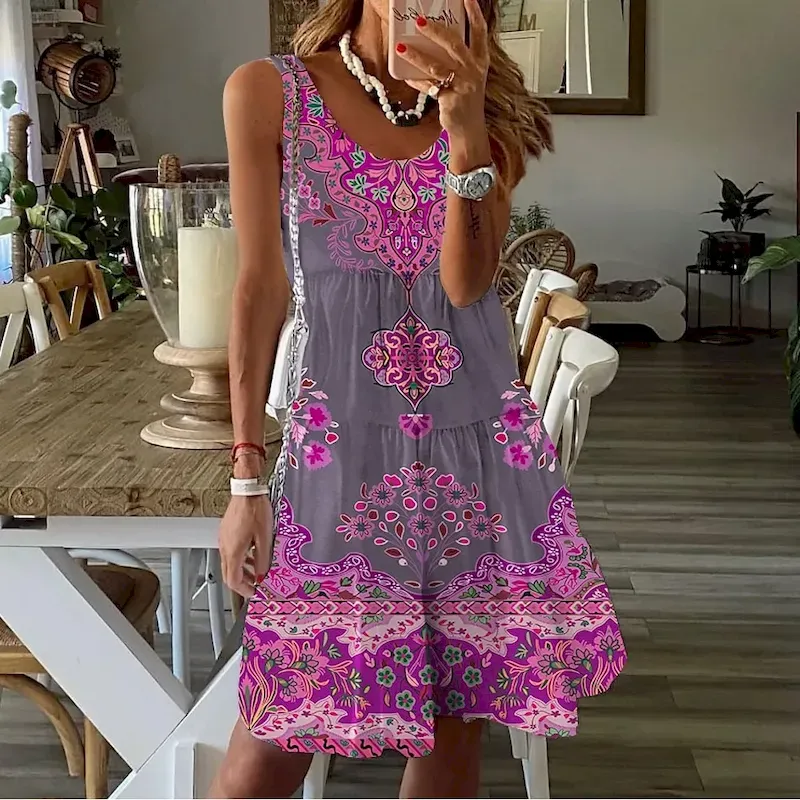 [Design Highlights]: The vibrant floral patterns lend a bohemian charm, enhanced by the chic ruffle trim and asymmetrical hem. The sleeveless design coupled with the elegant U-neckline adds to the dress’s summery appeal, making it an ideal piece for beach vacations and tropical adventures.