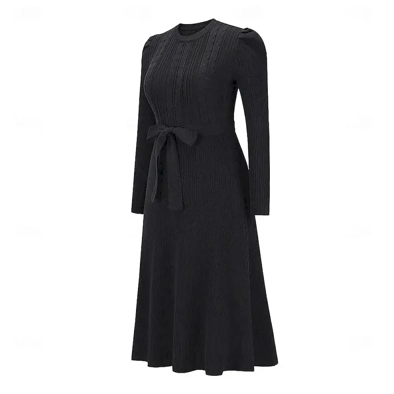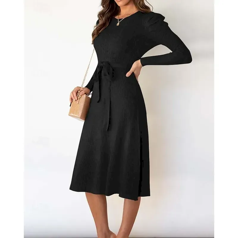 [Silhouette]: The dress boasts a flattering regular fit design with a round crew neckline and long sleeves, providing both elegance and a timeless silhouette. The ribbed knit fabric ensures a stylish fit that adds sophistication to any outfit.